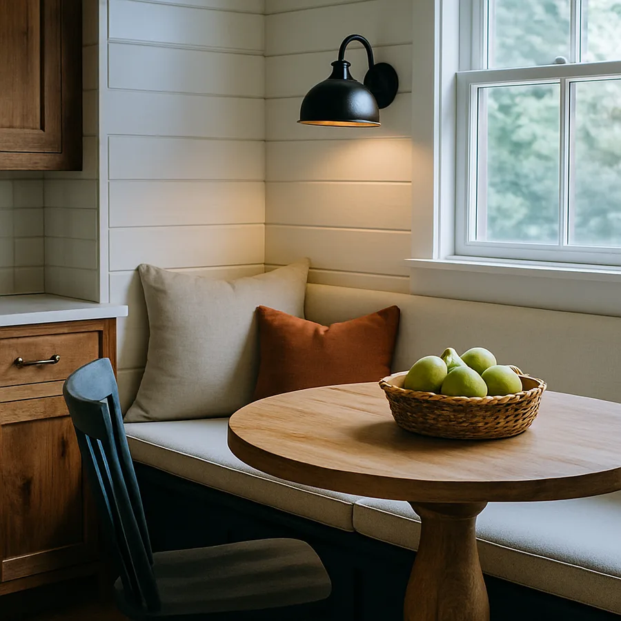 A well-designed banquette nook deserves lighting that sets it apart from the kitchen's general task illumination. A pendant light or small chandelier hung directly above the center of the table defines the dining nook as its own zone within the kitchen and provides focused, warm light that makes meals feel more intentional. The fixture should hang 28 to 34 inches above the tabletop -- low enough to create intimacy but high enough that no one bumps their head reaching across the table. A dimmer switch is essential, allowing the light to shift from bright task lighting during homework time to soft ambient glow during dinner.
