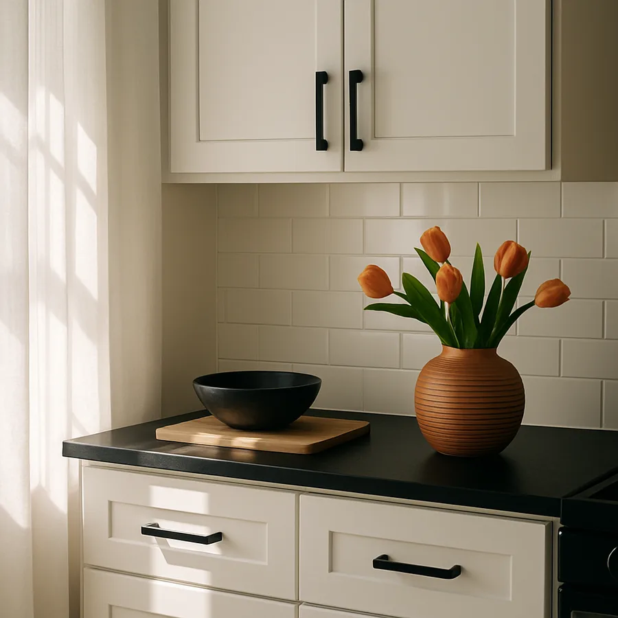 Countertop edges and appliance handles represent the final layer of coordination. Stainless steel appliances dominate the residential market, and their cool metallic tone coexists peacefully with matte black hardware - the contrast is intentional and reads as designed rather than mismatched. If your appliances feature black stainless or matte black panels, matching hardware creates a cohesive threading of that finish through the room. Countertop edges in lighter materials like white quartz or butcher block provide a neutral zone between the cabinet and backsplash planes, and they generally do not influence the hardware finish choice as strongly as the cabinetry color or the backsplash material.