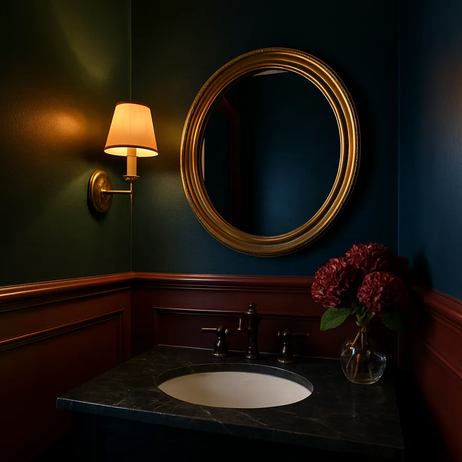 Layering matters more here than in a bright room. A single overhead fixture in a dark powder room creates hard shadows under the eyes at the mirror and makes the room feel underlit even when the lumen count is correct. Add wall sconces flanking or above the mirror at eye level, because sconces light the face and bring the painted walls to life. If you can dim the overhead and leave the sconces at full, you get the most flattering light for both the user and the paint.