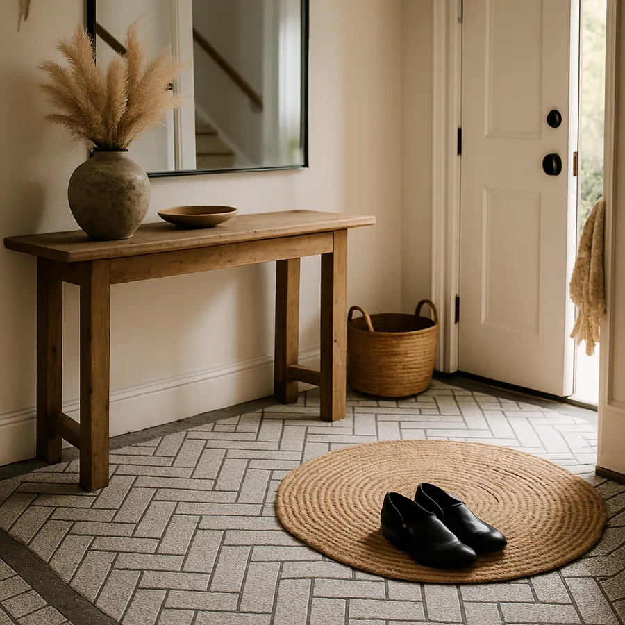 The entryway is the hardest-working floor in the house, and its pattern choice determines whether you spend weekends deep-cleaning or drinking coffee. Variegated mid-tone porcelain in a herringbone, pinwheel, or random ashlar layout, paired with warm-gray or taupe epoxy grout and a matte finish in the 0.55 to 0.65 DCOF range, will outperform almost any other combination on both the visual and maintenance axes. Layer in a two-stage walk-off mat system and a neutral-pH cleaning routine, and you can buy yourself days to weeks between the moments when the floor actually looks like it needs attention.