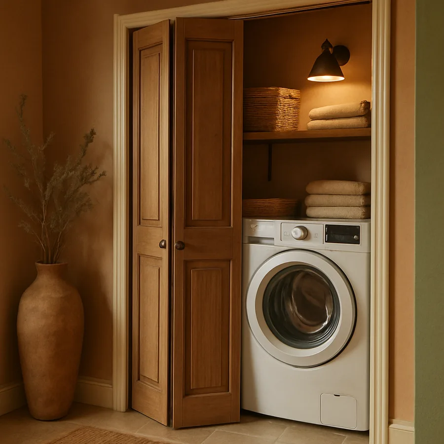 Bifold doors solve this problem with elegant simplicity. They fold flat against the sides of the closet opening, provide full access to the machines when open, and present a clean, unbroken surface when closed. Unlike hinged doors that swing into the hallway and block foot traffic, bifold panels collapse within the width of the opening itself. This makes them the most space-efficient concealment option for hallway laundry installations.