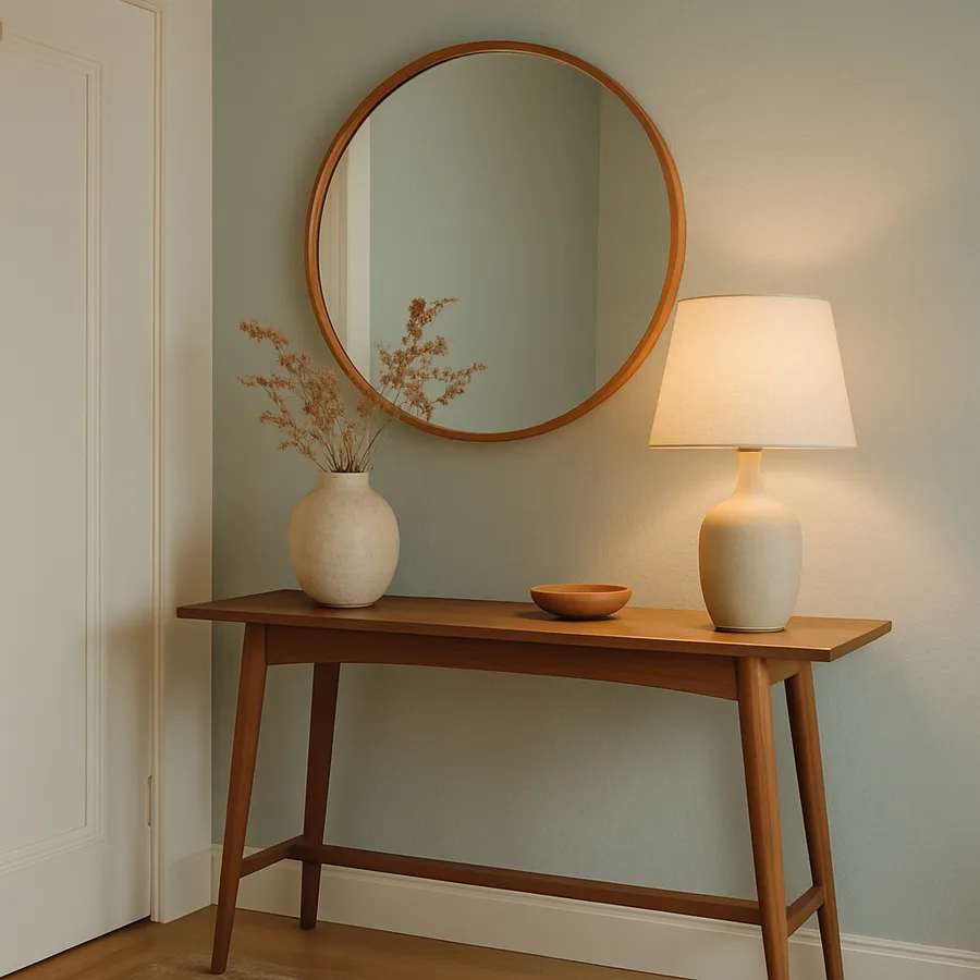 A well-chosen mirror does more than provide a last-check reflection before you leave the house; it doubles the perceived depth of the entryway and amplifies both natural and artificial light. The most iconic mid-century mirror shape is the sunburst, with radiating metal spokes in brass or gold-finished wire surrounding a central convex or flat glass. While the sunburst has been widely reproduced and can veer into cliche if not selected carefully, a vintage or high-quality reproduction piece retains its power as a statement element. Look for examples with irregular spoke lengths and a hand-finished quality that distinguishes them from mass-market versions.