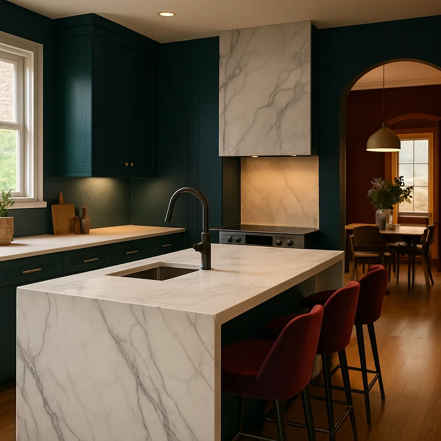 According to the National Kitchen and Bath Association (NKBA), roughly 41% of remodels completed in the last eighteen months included some form of continuous-edge stone treatment on the island, up from just 12% five years earlier. The Marble Institute of America (now part of the Natural Stone Institute) has also noted a corresponding rise in bookmatched slab requests for residential kitchens. This guide walks through the decisions that separate a waterfall island that ages gracefully from one that looks dated within a season.